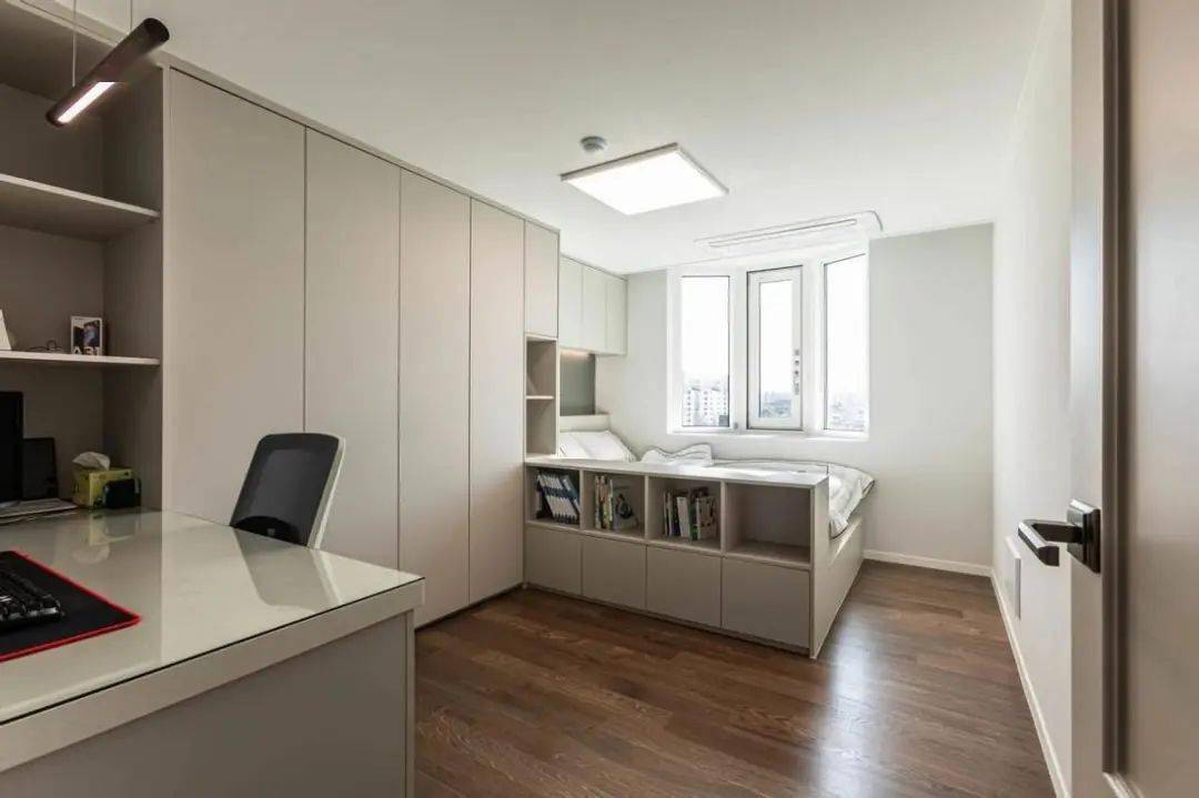 卧室面积允许的情况下,在整面衣柜留空做床头置物区的基础上,还可以延伸出办公区,同时满足屋主对于收纳、学习、床头置物的不同生活需求。学习区侧面加入局部玻璃书柜,收纳书本不用担心落灰,拿取也很方便。