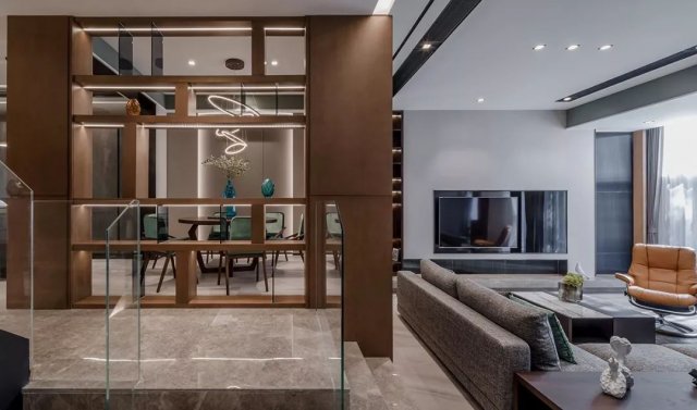 从入户的大门进入空间,入户的鞋帽柜穿插着展示功能的开放搁架,主人的收藏品从一进门的开始就可以展示。右手边卫生间干区的台面悬挑出来,被一面玻璃从中切割,形成独特的穿插美学。左手边的中厨,开放式西厨和餐厅一字排开,在中厨和过道之间,设计师结合原建筑的“L”形柱,用木作和深色玻璃打造了一面展示隔断,在视觉和空间上围合了餐厅区域,使之更具围合的聚合感。沿着过道来到一层的中心客厅,这里的下沉结构设计师将楼梯进行多层次的艺术化处理,使之更具有韵律的雕塑美感,将客厅和阳台打通,获得更为宽敞的视觉和空间效果,但随之而来的一根承重柱则在客厅暴露出来,这里设计师将柱子的形态进行了重新设计,使它具有重点展示功能,KAWS的解剖玩偶放置这里,时尚而新颖。电视墙的设计则依靠了空间的层高优势布置了通高的展示架,在光影交错中演绎了精致而纯粹的美学。