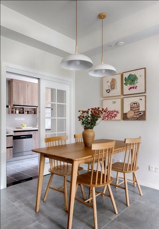 灰色地面、米色墙面、白色灯罩、鲜花等于三餐四季。