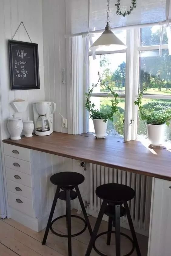 如果你希望家里有飘窗但是事与愿违无法拥有,那试试在窗边钉上一块木隔板吧,这不就成一个小吧台了么!