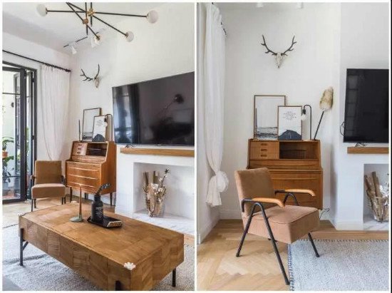 中古风的休闲椅+秘书柜,不定期的更改主题,布置一些摆件、装饰画、干花/灯具(为屋主选取的北欧风画作,花费不高却能营造出非常自由闲适的生活情趣),一个满足独处阅读、喝茶、思考的休闲角落就这样赏心悦目地出现了!