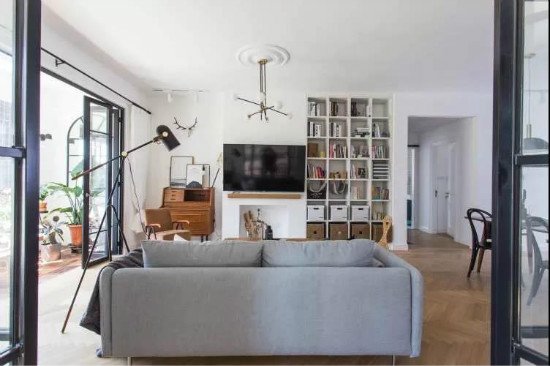 全开放式的书架作为电视墙的一份子,也是家中的气质担当,下面的位置方便弯腰拿取,客厅零散的物件和小孩的玩具,可用置物筐统一收纳。中间的位置随手可得,便放了夫妇俩最爱的书籍和常用小物。上方则是用于收纳不常用的书籍或收纳箱,整体的收纳物件的颜色控制在一个色系的时候整个柜子就会看着很舒服。
