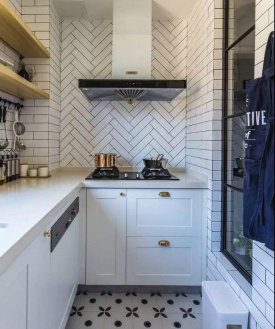 在色彩风格上,从墙面、柜体再到地面的黑白花砖,整体色调整齐划一,又通过不同的拼接方式,让空间变得生动起来!