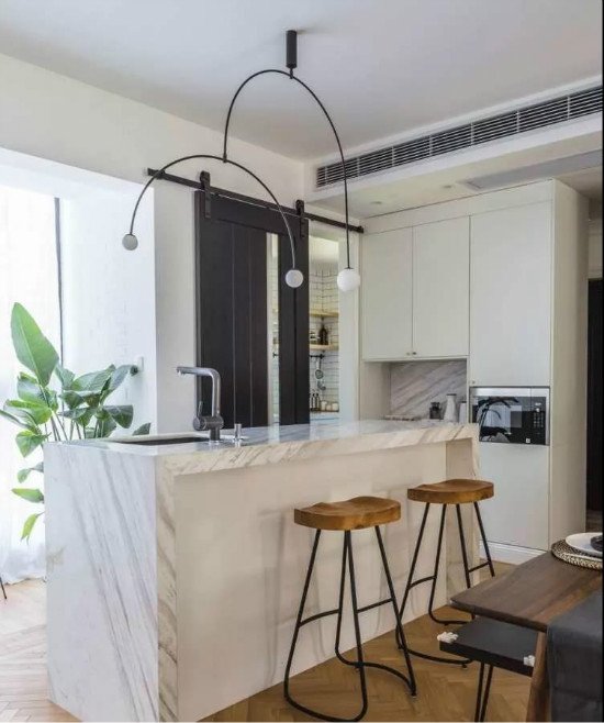 大理石的台面下做了镂空刚刚好放下2个高脚凳中岛的四周分别是玄关鞋柜背面的茶水柜,装着谷仓门的厨房入口,做了壁龛的装饰墙面,和餐厅、客厅、阳台