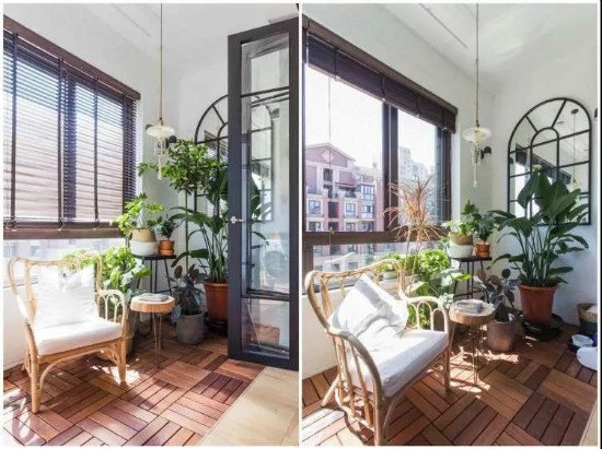 在设计这套房子时,面对横向的阳台和窗户,想起了多年前在加拿大求学的日子,下课回家路过的咖啡馆,铁艺门窗前摆满了层层叠叠的绿植,店铺外的藤椅,喝咖啡的客人悠闲又自在!于是就有了这一组阳台小景灵感!