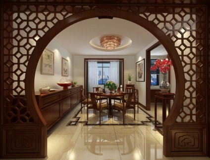 餐厅:中国风十足的月亮门做隔断,餐厅内使用中式典型的家具,整个空间看起来不单调而且整体感觉端庄大气,格调十足。