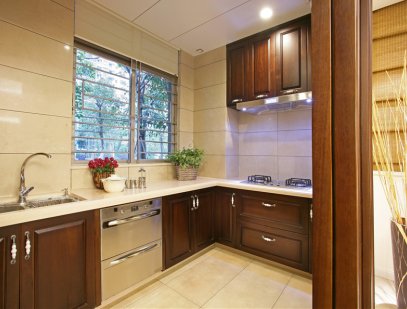 厨房:使用蜡黄色瓷砖来调配整体色调,实木橱柜质感十足,超大的窗户,采光非常好,搭配恰到好处的灯光让厨房整洁而清爽!