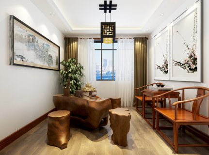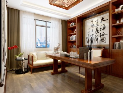 书房:能够体现业主的内心,整体设计提升业主的身份与品位,用了中式的组合柜做背景,美观且实用,在书桌对面,挂了几幅轴画。简单不失中式韵味。