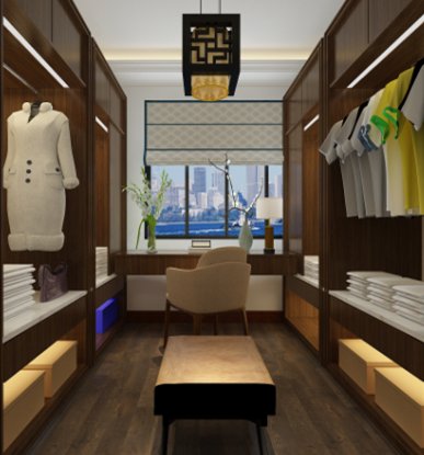 衣帽间:拥有收纳功能强大的独立衣帽间,是所有女人的梦想,将自己和家人心爱的衣物分门别类的放好,结合灯光营造气氛,不仅出门换装更方便,而且换装的过程犹如重回购物时的兴奋之情,营造出如精品服饰店的空间氛围。