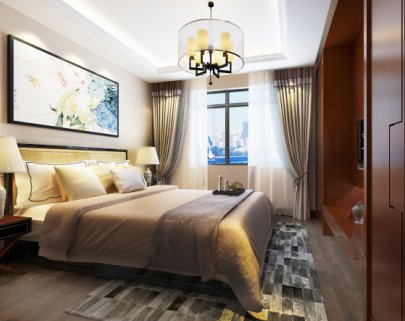 卧室:本案业主喜欢中式风格,装饰也不要太繁琐承重,要简单一点,所以设计师将主卧墙面选用暖色调的奶咖色搭配全屋中式家具,床头背景墙用中式画做点缀,整个空间看起来更加和谐。