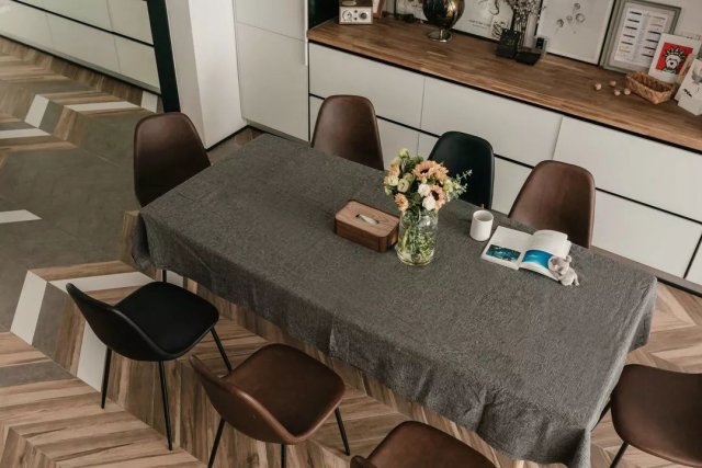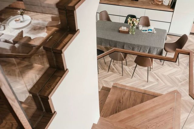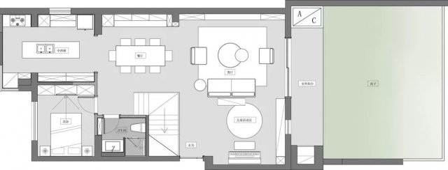 设计师调整了原楼梯上楼的位置,从户型图上看,原本的位置浪费了一大块区域,动线不分明,而通过设计师的改变后,将空出来的区域“变”成了现在的餐厅。
