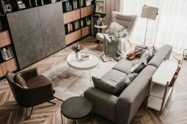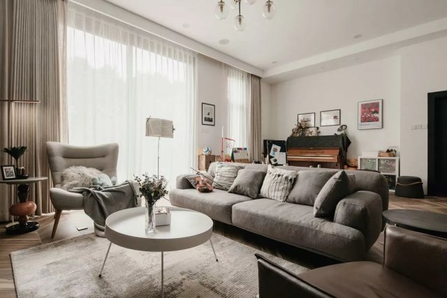 暖灰、杏色、原木色,整个客厅的色调温暖又天然,布局随心自由,让人舒适放松,充满“人味儿”。