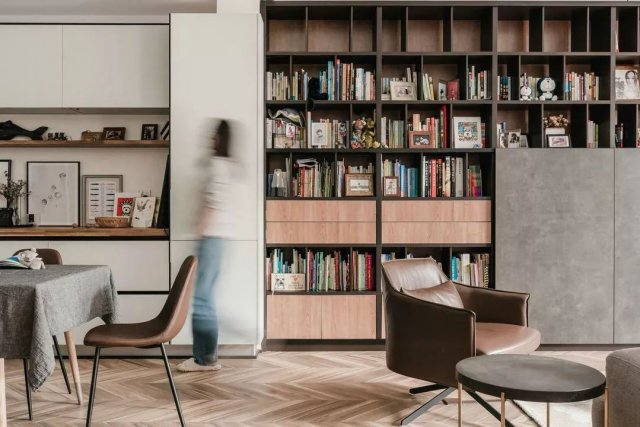 占据了客厅一整面墙的不规则木质书架组合里既有着着屋主的藏书,也有大量小王子的读物,各种手办、玩偶,电视机隐藏在两扇灰色推拉木门之后,而穿杂书柜与小几上随处可见的各种相框里一只可爱的雪纳瑞特别抓眼球,据了解,这只狗狗是陪伴了屋主十余年的心头宝,虽然已寿终正寝,但给屋主留下了无数美好的回忆,屋主将狗狗的照片摆在房间各个位置,仿佛它一直都在,永远守护在她身边。