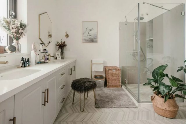 主卧的卫生间空间充足,推门进入,左侧靠窗白色台面的双台盆洗手池组,男女主人各有一块天地,彼此互不影响又能增进距离。下方则是黄铜拉手的白色柜组,储物能力强大。