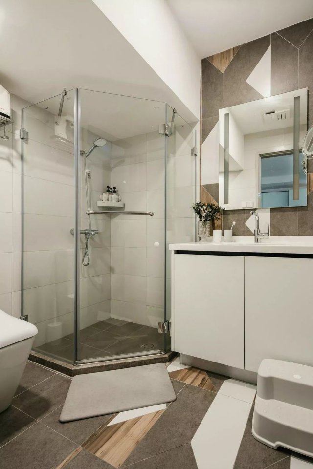 一层客卫位于客卧和厨房之间,干湿分离,地面和洗手台墙面都用仿木瓷砖做不规则拼接,消除沉闷。