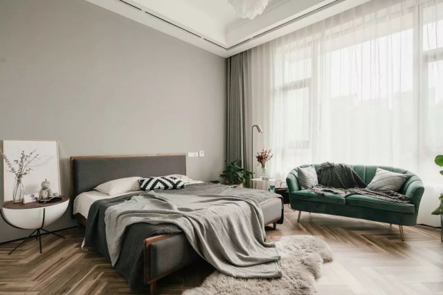 人字拼接的仿木地砖,浅灰色背景墙,为主卧定下基调,深灰+实木的北欧风双人大床和同色系的床上用品都给人静懿、安眠的舒适感。