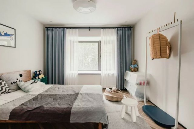 小主人的房间则保留了飘窗,满足这个年龄阶段喜欢“上下求索”活泼好动的天性。由于大部分的玩具都在一楼儿童活动区域,小主人的房间显得干净整洁。