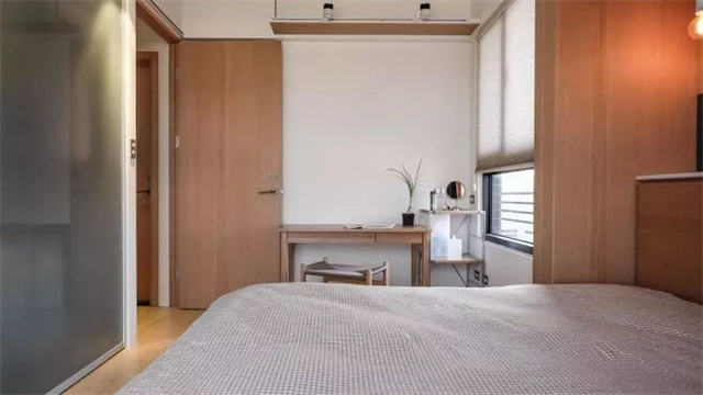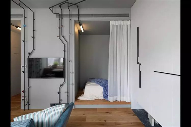 针对小户型的卧室怎么大利用?可以把地板架高一点,让睡眠区有点卧榻感,下方也能成为收纳抽屉,朋友来时,因为高度够高,地板就成为了可坐可卧的空间,多惬意。