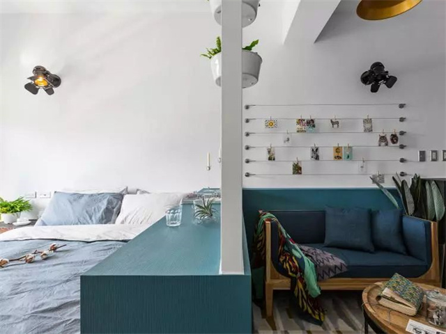 选张矮柜直接区隔出客厅与卧室,也是一种简单易学的方法,柜子颜色再选更有特色的蓝绿色、绿色或蓝色,更让整个空间更有性格了。